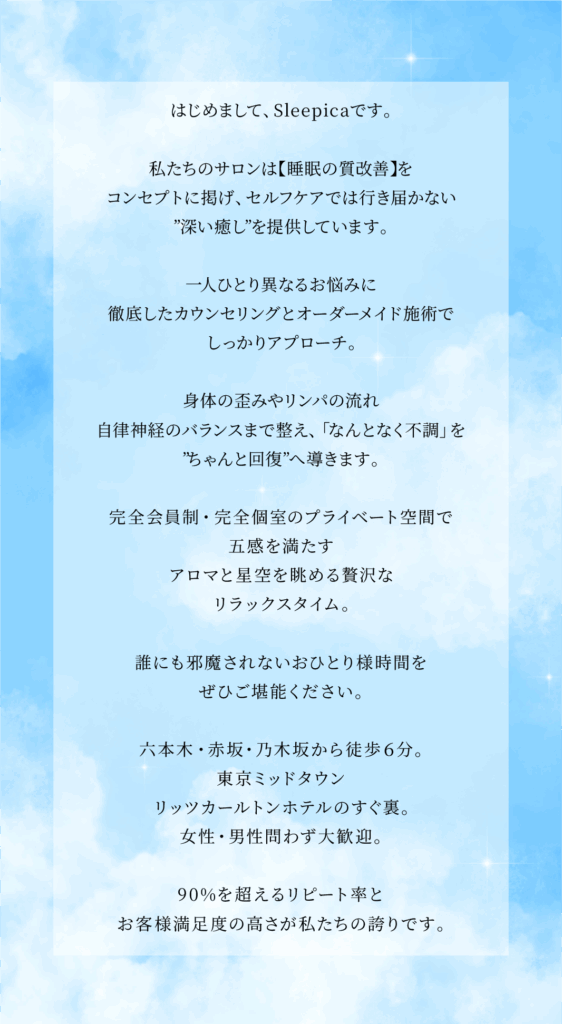 海外出張が多く時差ぼけに悩んでいましたが、こちらのサロンで体内リズムが整いました。9つの資格を持つセラピストさんの施術は他とは違う専門性を感じます。星空の照明も癒されます。