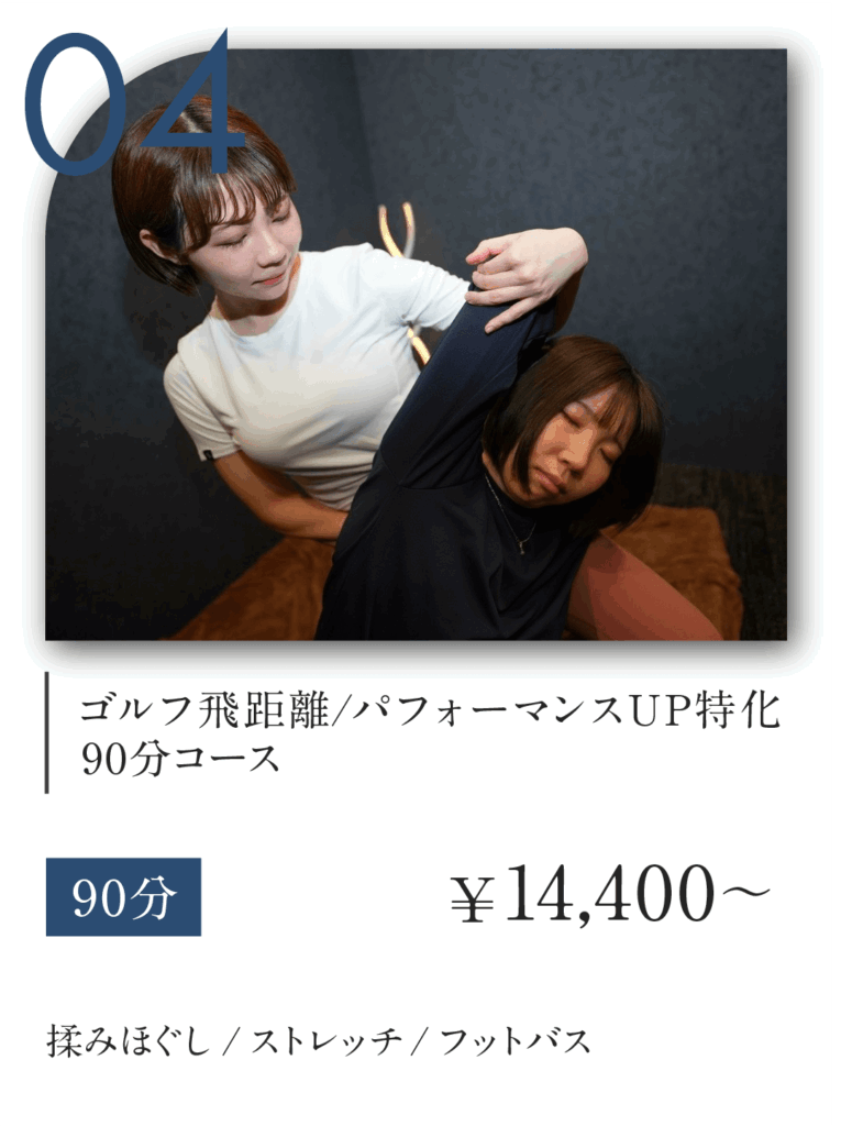 ゴルフ前後に利用しています。素晴らしい対応と、身体の細部まで知り尽くしたケア、マッサージで至福の時間でした。身体の可動域が広がって、ラウンド中もスイングが楽になりました。お人柄、話も上手で素晴らしかったです。また予約させて頂きます!
